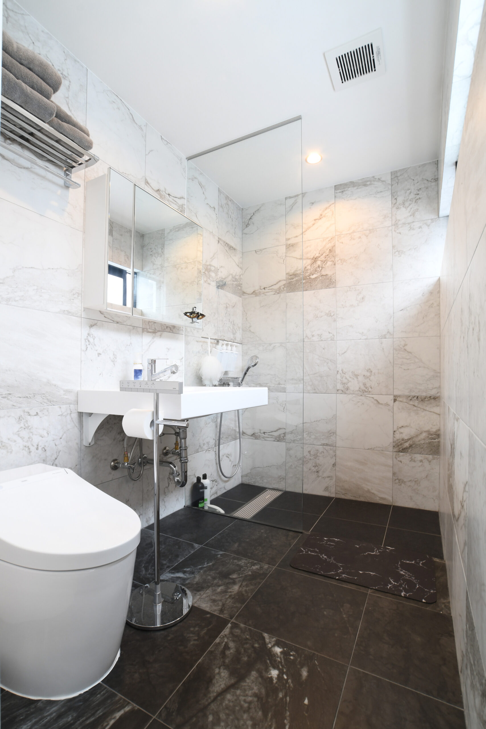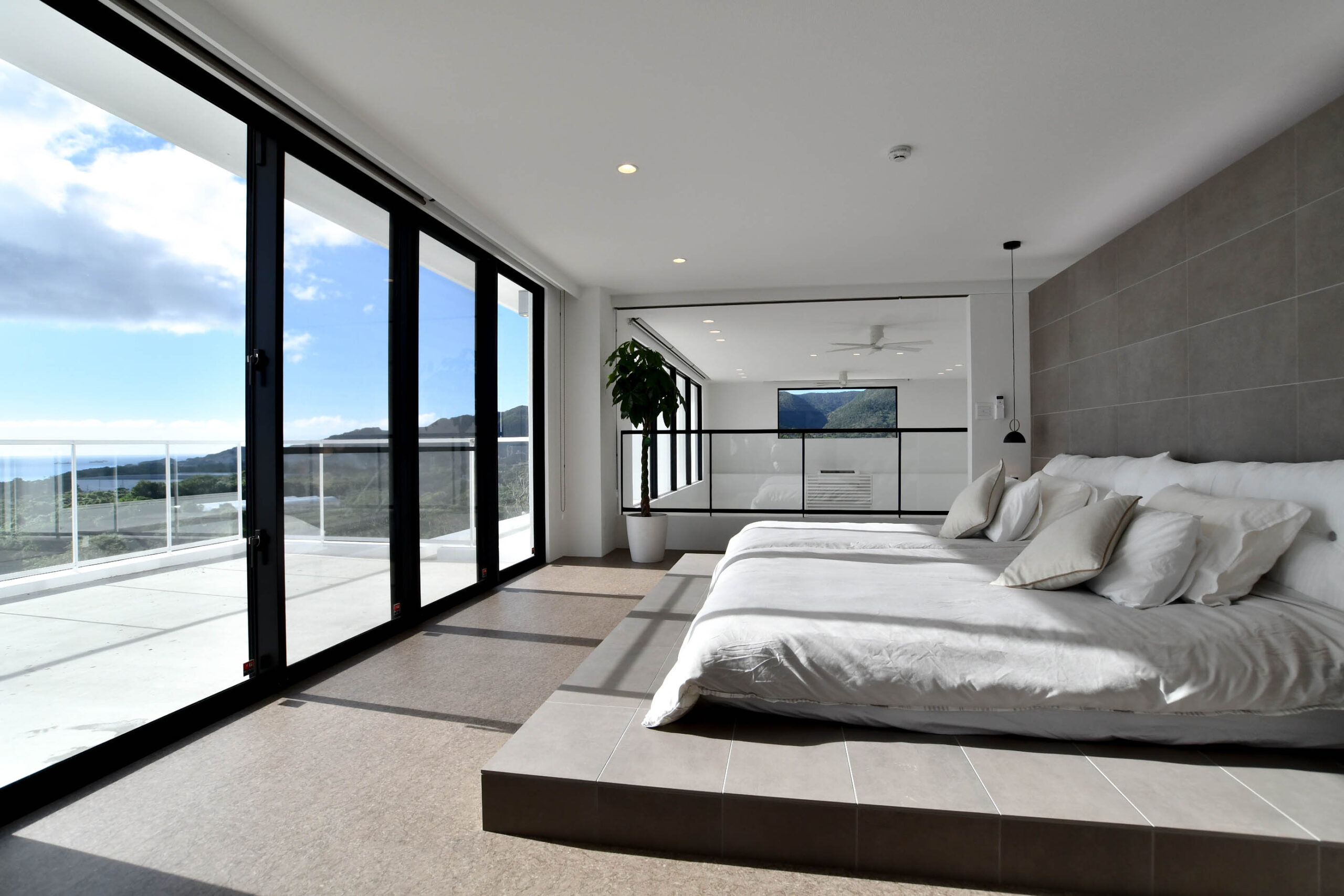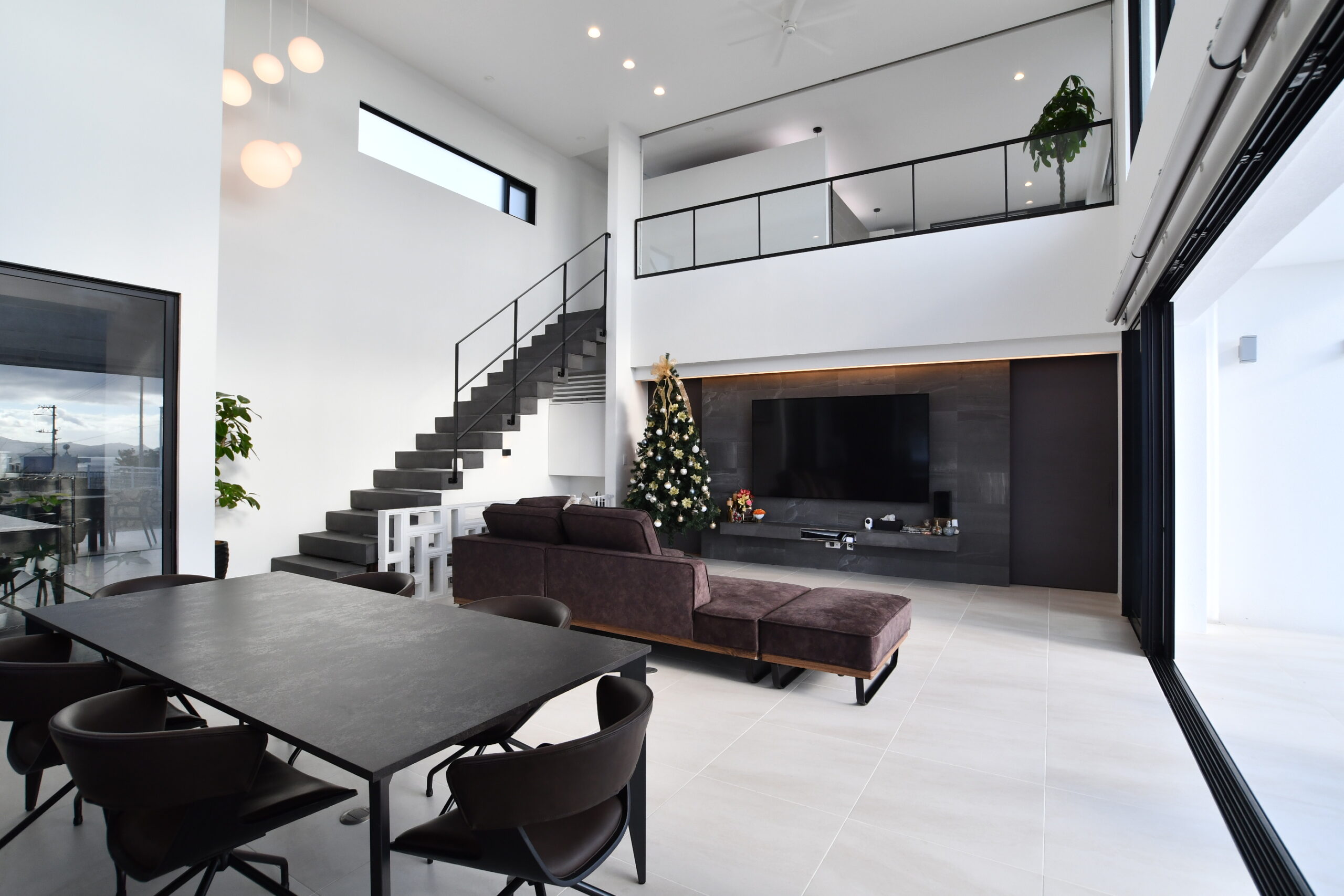 開発が進む沖縄本島の中でも比較的、多くの自然を残す、本島北部に位置する。「開放的な空間」をテーマにプランを行った。LDKと2階のベッドルームは、吹き抜けを介してリビングと連続した位置にあり、一体的な気積の大きな空間を確保し、広がりのある空間とすることで、ホテルライクな雰囲気を演出している。また、外部からの視線が届きにくい敷地の特性を活かし、バスルームはガラス張りになっている。 また、名護湾の海や空の青と好対照をなす、やんばるの深緑の中に、室内外共に白を基調とすることでリゾートの様な高級感・清潔感を演出している。 敷地面積:188.51坪延床面積: 66.23坪