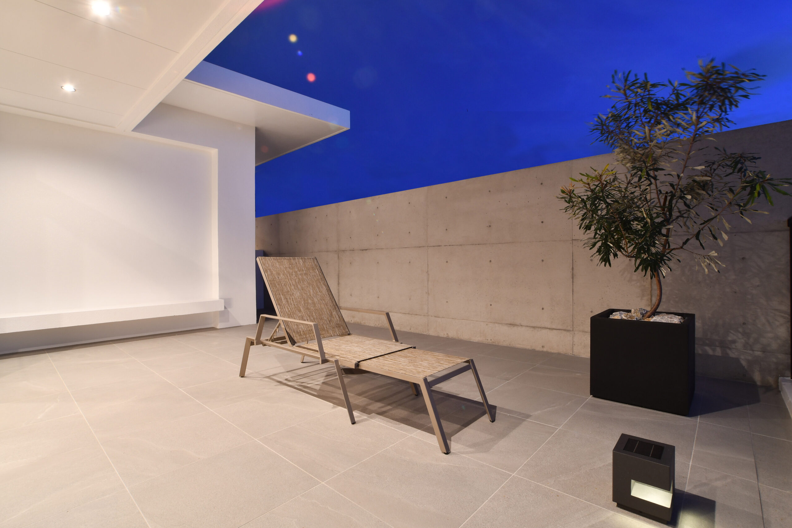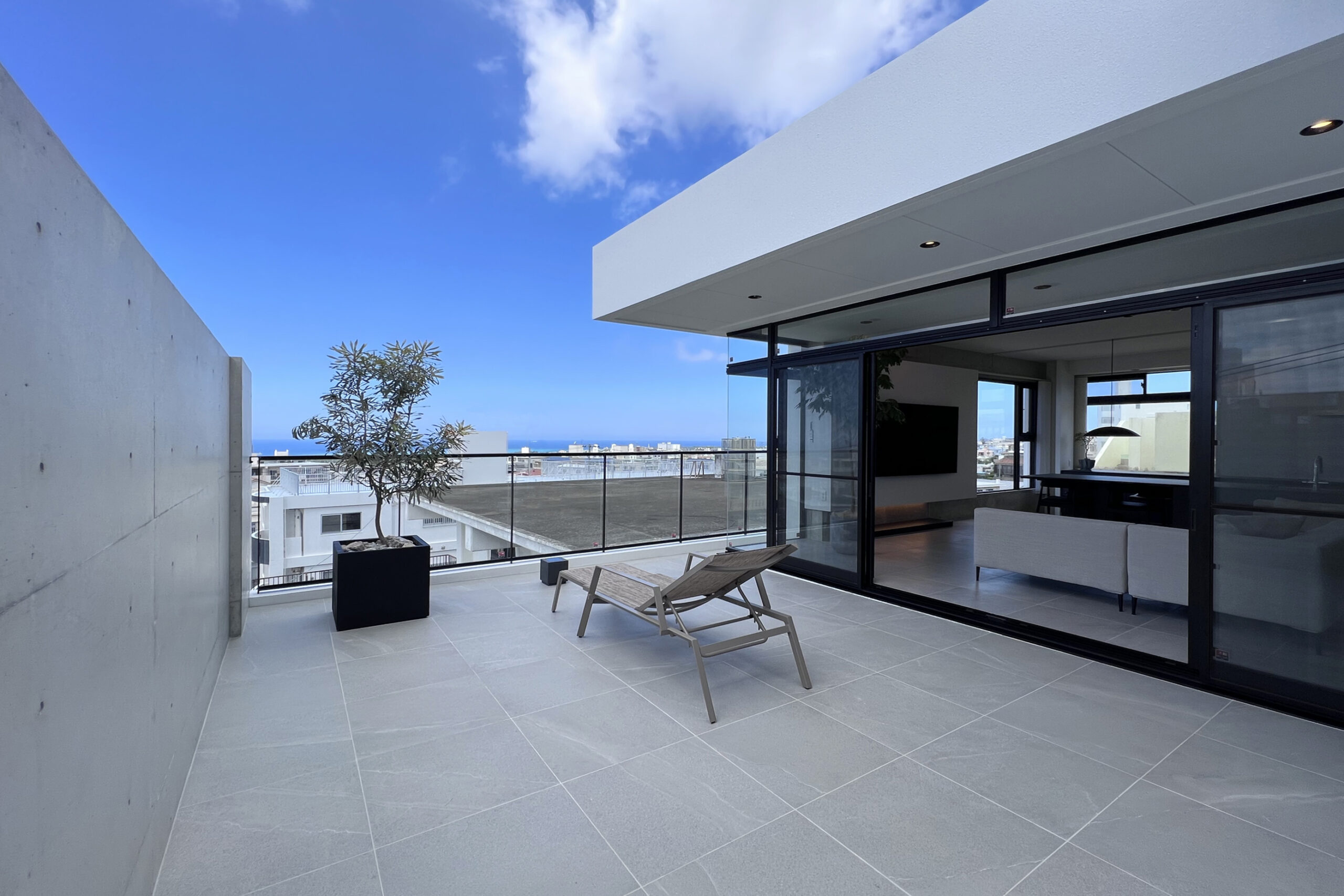西海岸の開けた景色を求めて、リビングを最上階の3階へ。フロア全体で視界180度の大パノラマを楽しむべく、LDKと屋外テラスをオープンにつばぎ、眺望サイドの壁は大胆なガラス張りに。解放感を高めるホワイトベースのインテリアには造作の家具や棚が生えます。